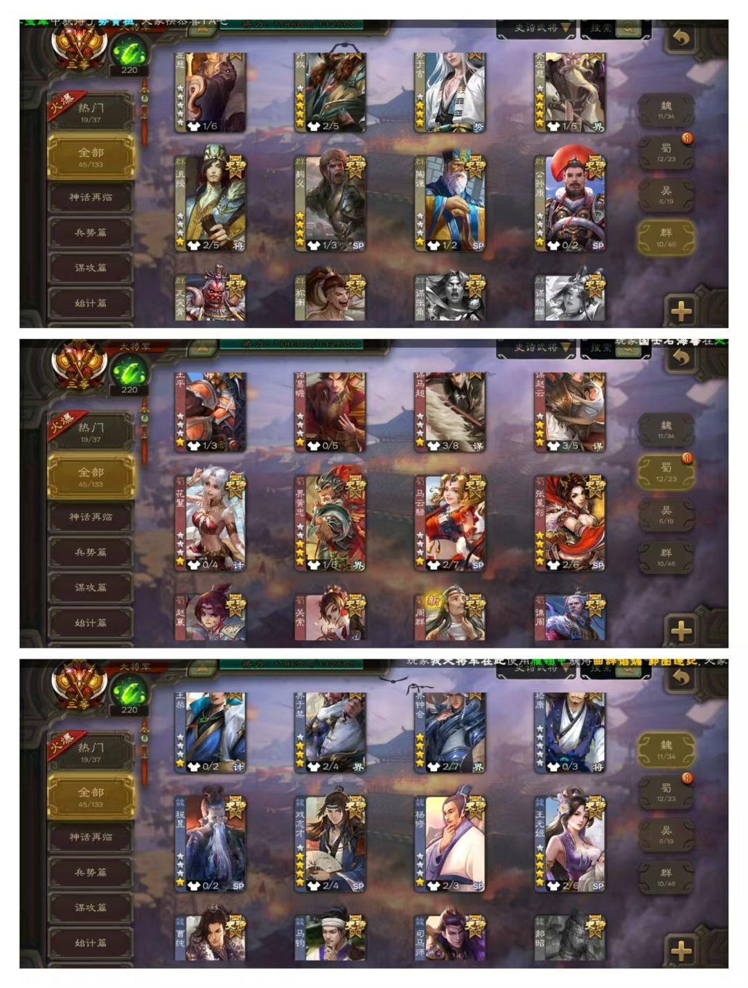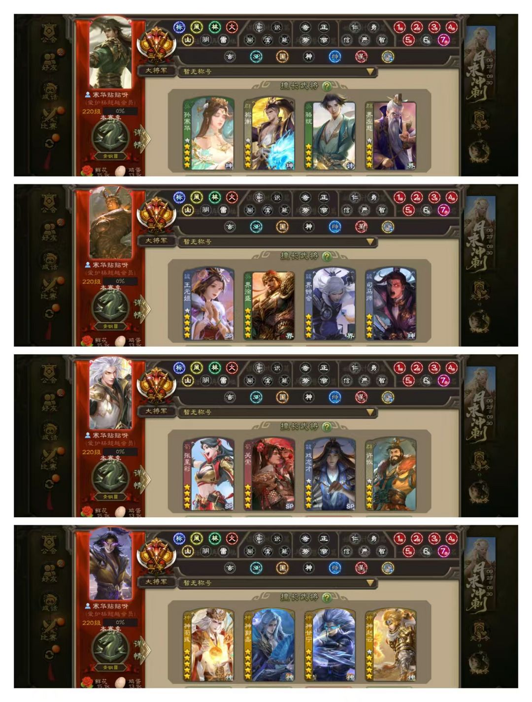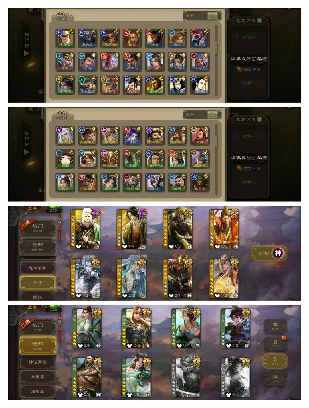 限制: 撤单率<19%才可租用此帐号装备描述:官方三等大将军,无卡,VIP10! 20四星玉龙:双形态回廊动神郭嘉,动神荀彧动神甘宁动神赵云动司马师动祢衡,动界钟会动王元姬动关索动张星彩动许攸,孙寒华马钧骆统留赞,聚义界徐盛界左慈! 45史诗武将,动谋马超,周群神太史慈等! 35动皮65金皮155国战皮肤!