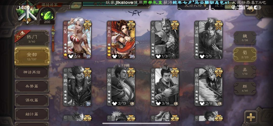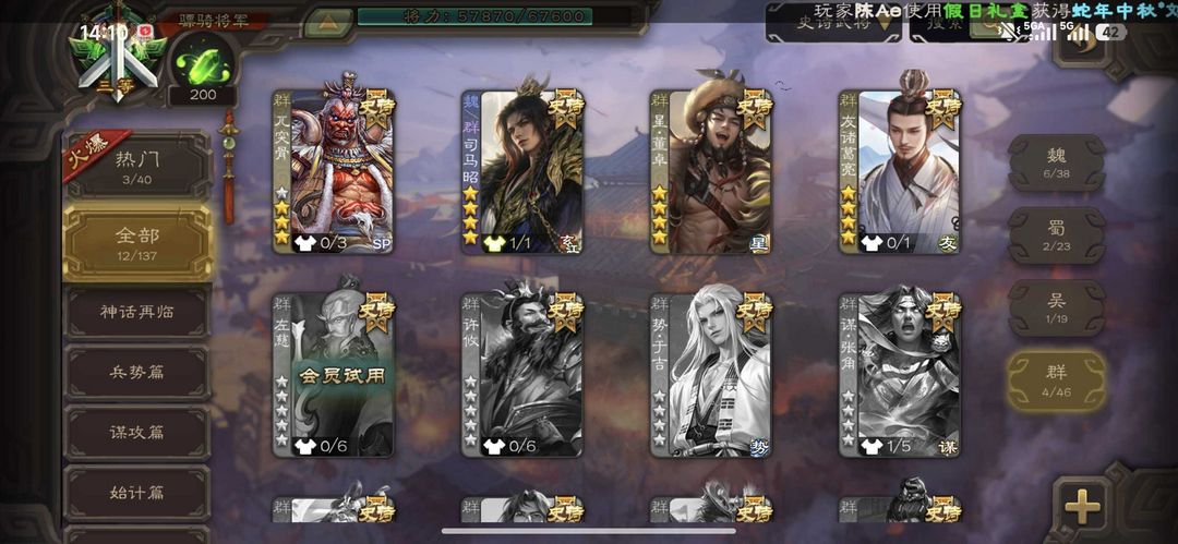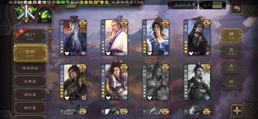 装备描述:动谋黄盖 友诸葛亮 曹髦 司马昭 郭女王 星董卓 曹纯 张星彩
