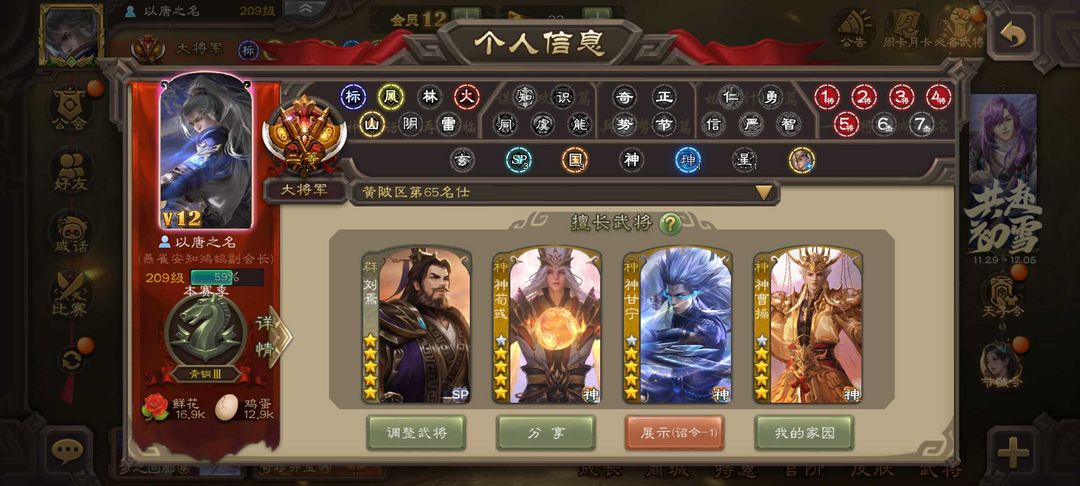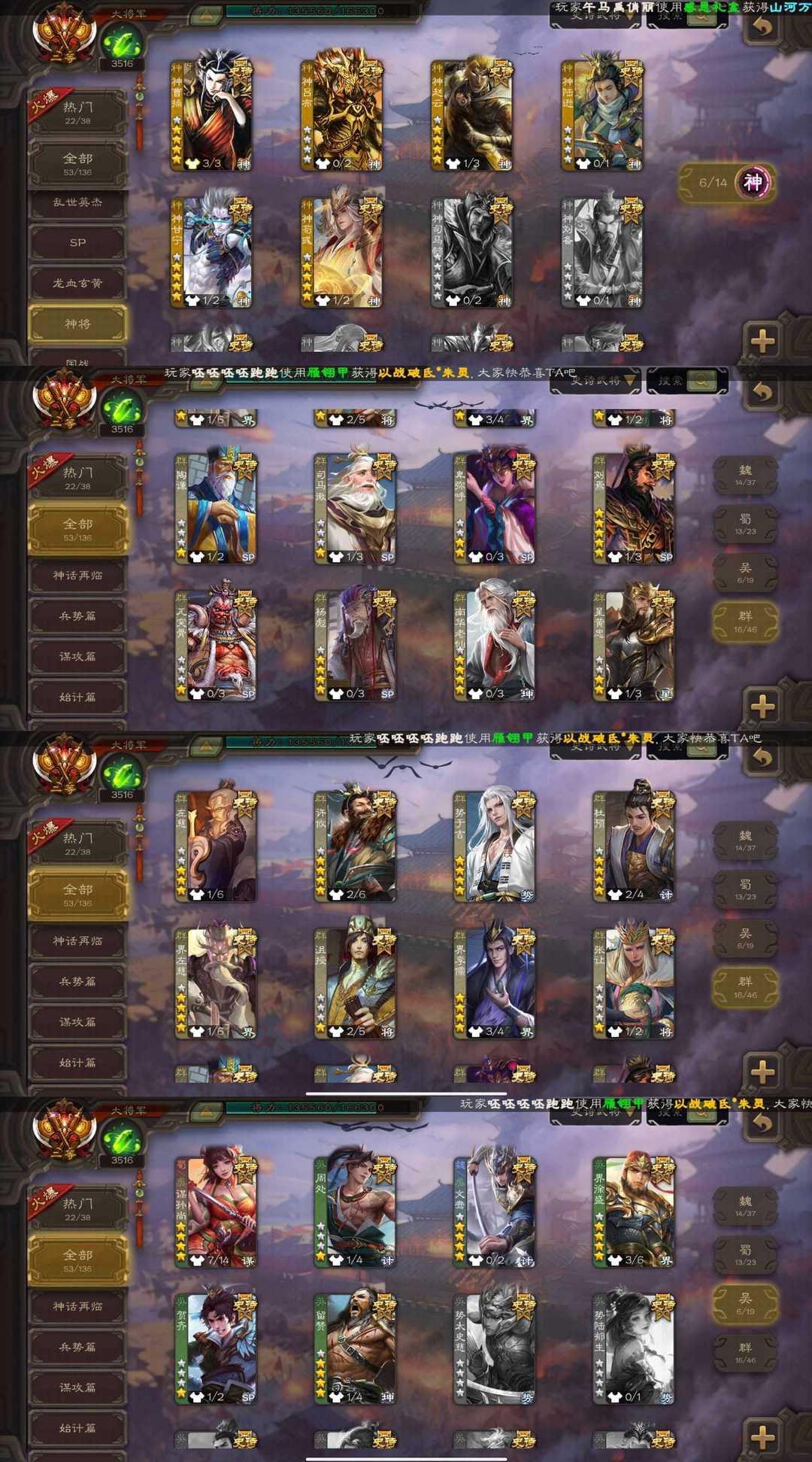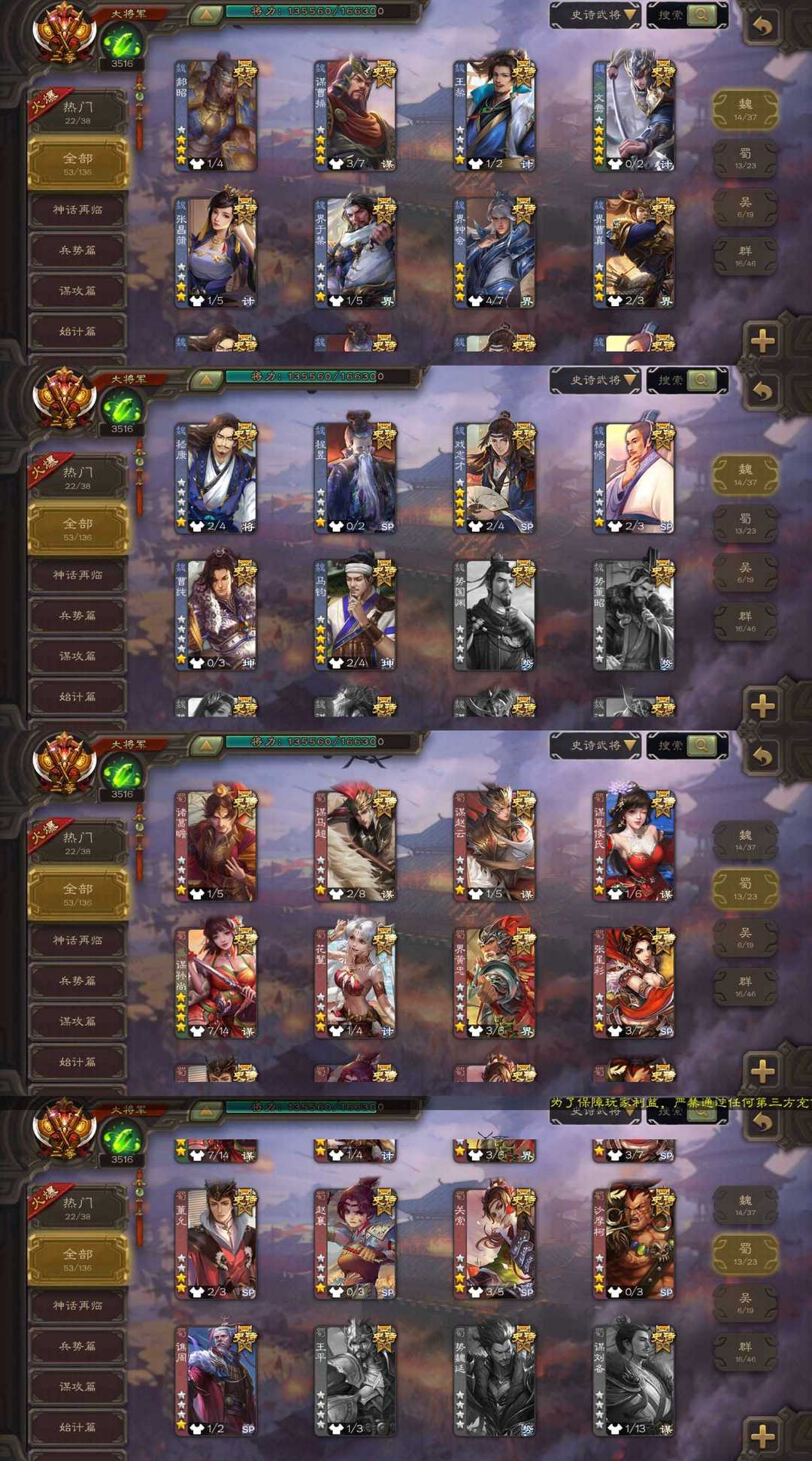 装备描述:【三卡充足】v12大将军⚡动态刘焉神荀彧神甘宁神曹⚡文鸯⚡双形态界钟会⚡动态杜预⚡动态谋孙尚香⚡